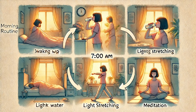 - 연계 습관 만들기 - 물 마신 후 5분 스트레칭이나 명상으로 연결해 '건강한 아침 루틴' 완성하기